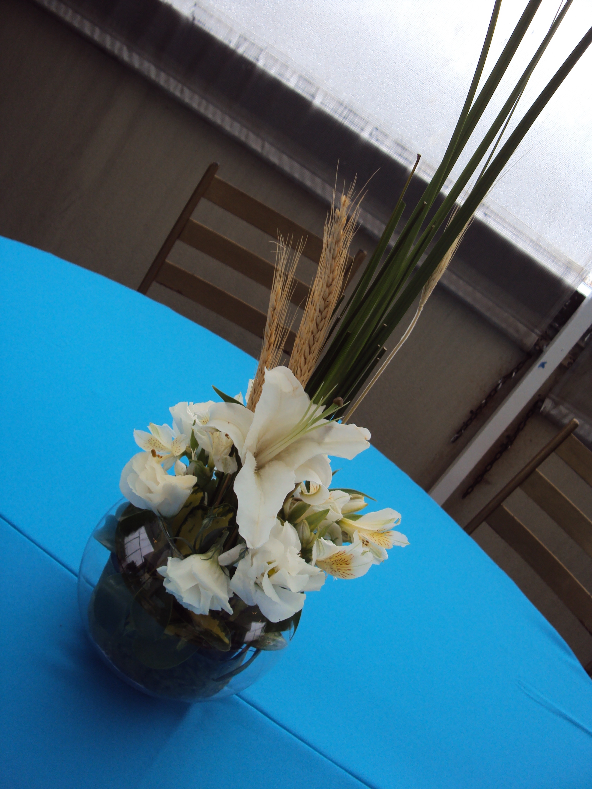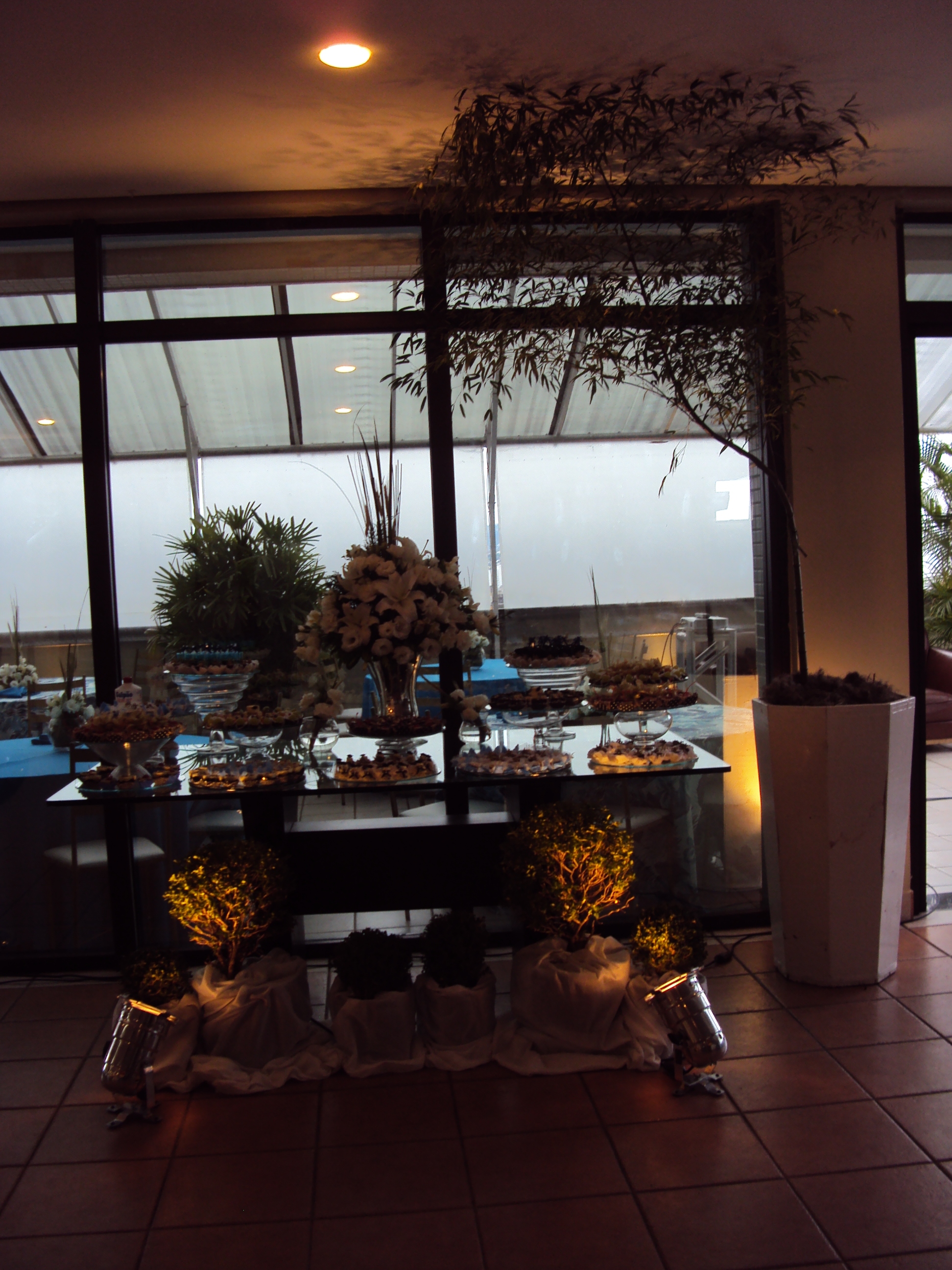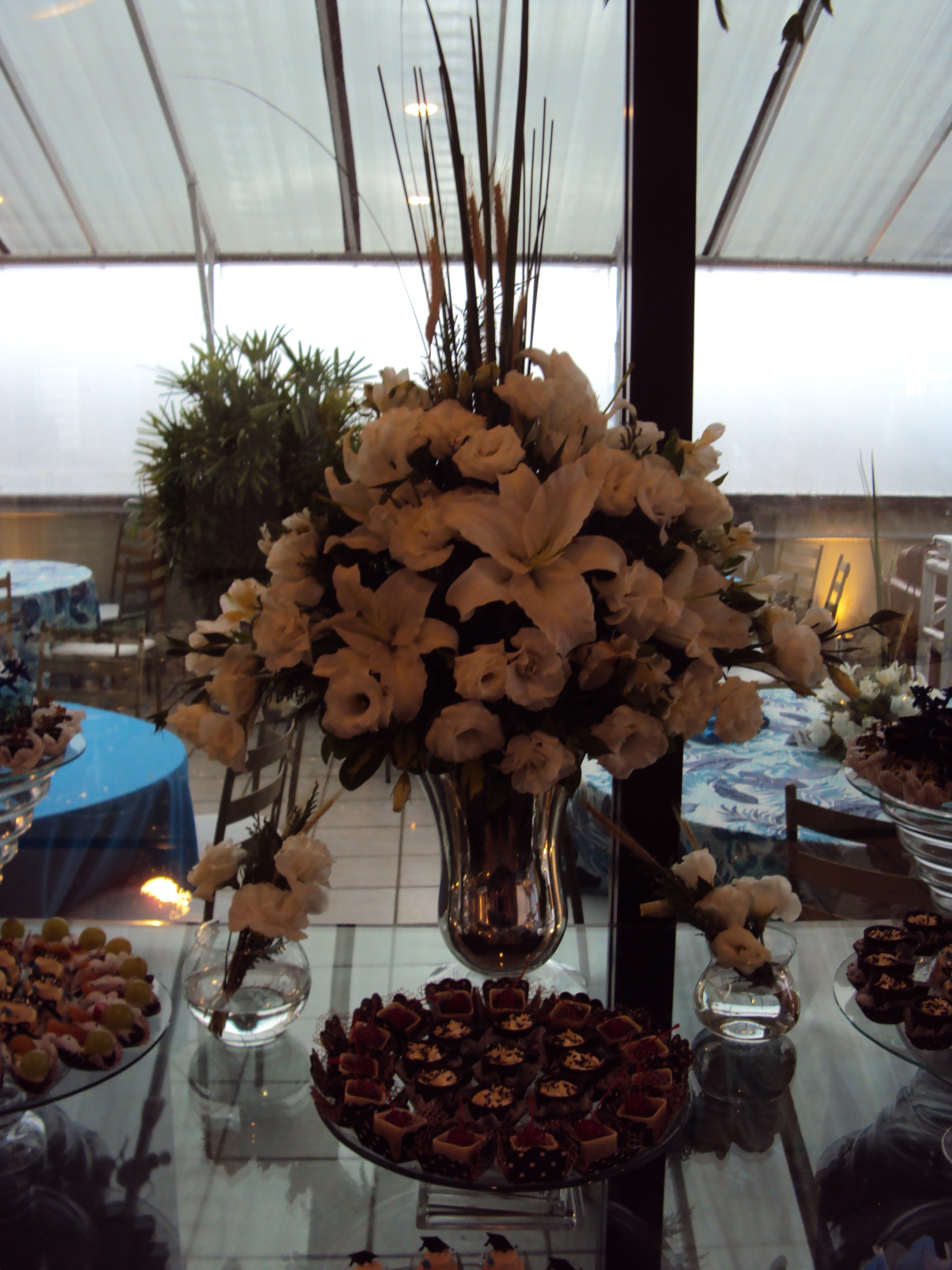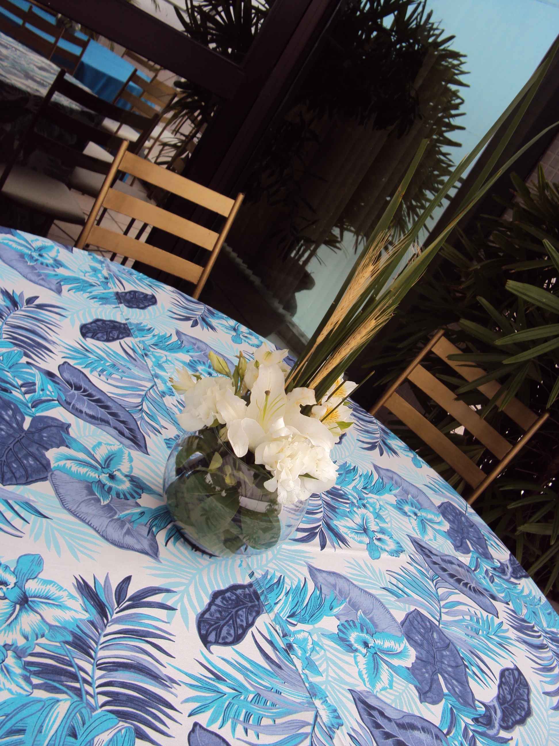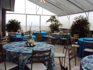 Recepção do formando de economia da UFRGS realizada  25/02/2012 na cobertura do La Defense. Decoração utilizando toalha azul turquesa e floral.